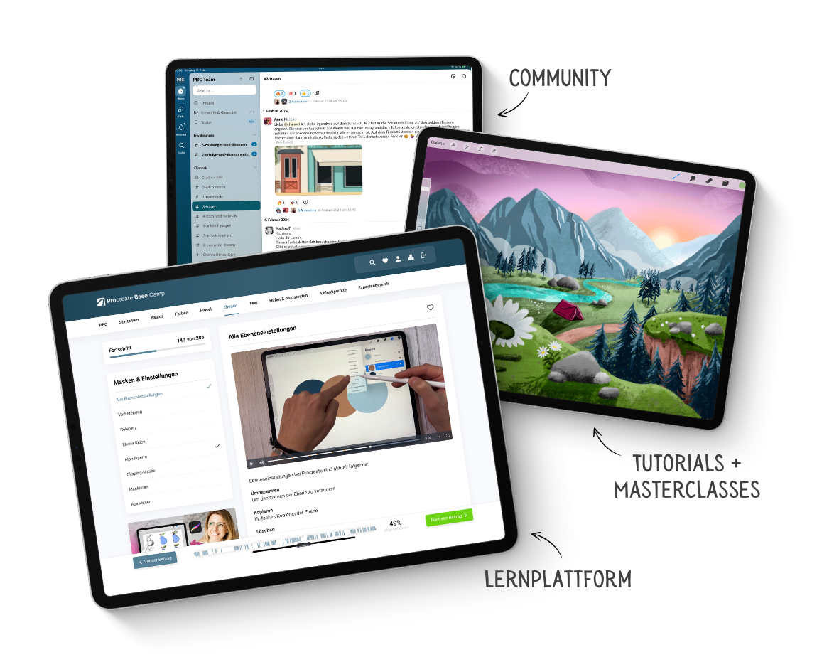 Procreate Base Camp ist DER umfangreichste deutschsprachige Kurs, um Procreate zu lernen und jederzeit nachschauen zu können, wie bestimmte Hacks und Einstellungen funktionieren. Du lernst im Expertenbereich wie Profis mit Procreate arbeiten und kannst durch deine individuellen Fragen im Communityportal die wachsenden Inhalte aktiv mitbestimmen. Inklusive wöchentlichen Übungen und jeden Monat eine neue Workshop-Sprechstunde.