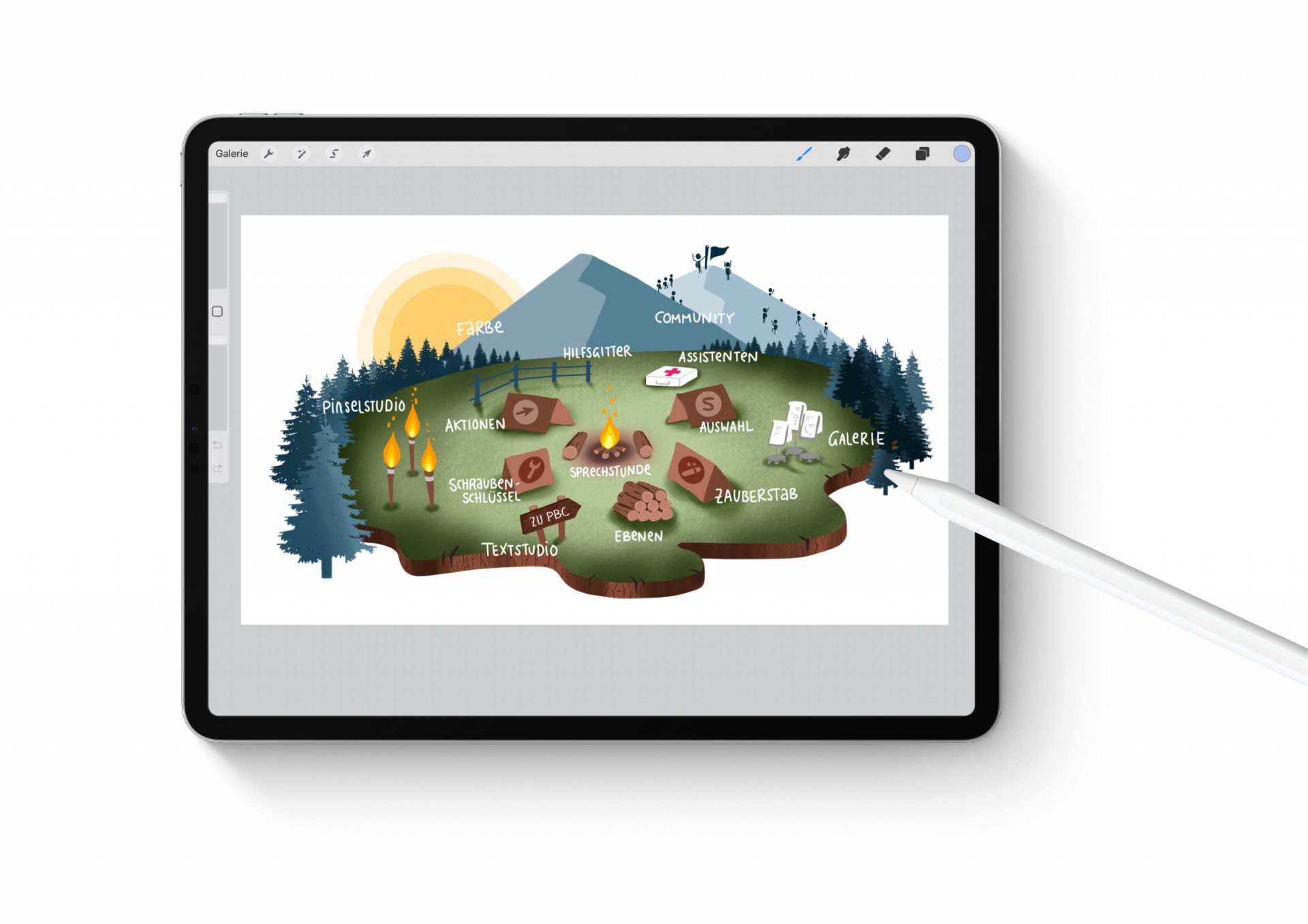 Procreate Base Camp ist ein dynamisches Kursmodell, bei dem du jederzeit einsteigen und die Module selbstständig, in eigener Geschwindigkeit durcharbeiten kannst.